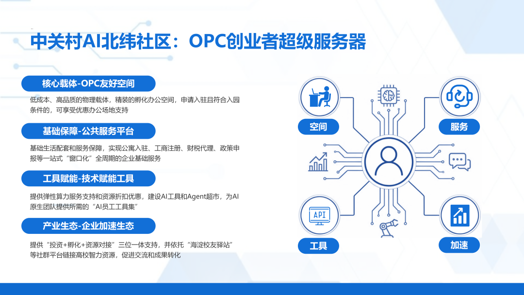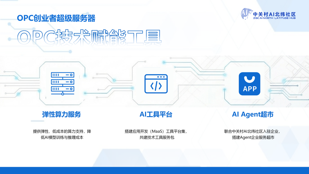工具赋能-技术赋能工具: 中关村AI北纬社区构建OPC技术支持体系,提供弹性、低成本的算力服务,有效减少OPC创业者模型训练与推演压力。同时联合百度、讯飞、智谱等头部企业,共建AI工具平台与Agent服务超市,打造覆盖应用开发的OPC技术工具服务包,让AI“数字员工”为创业者提供全场景支持,大幅降低OPC创业技术门槛。