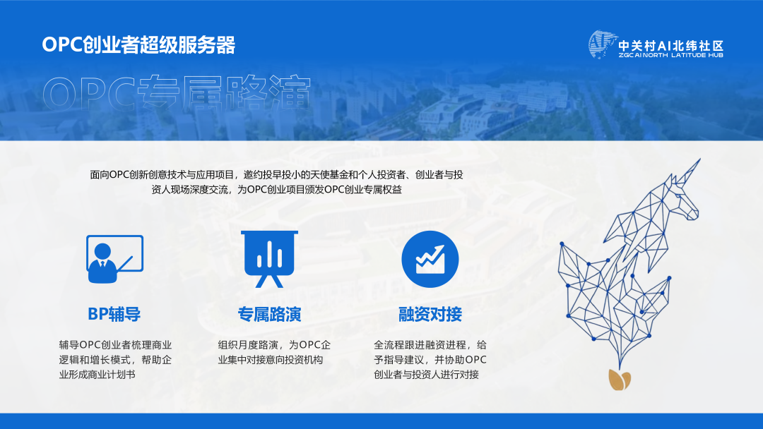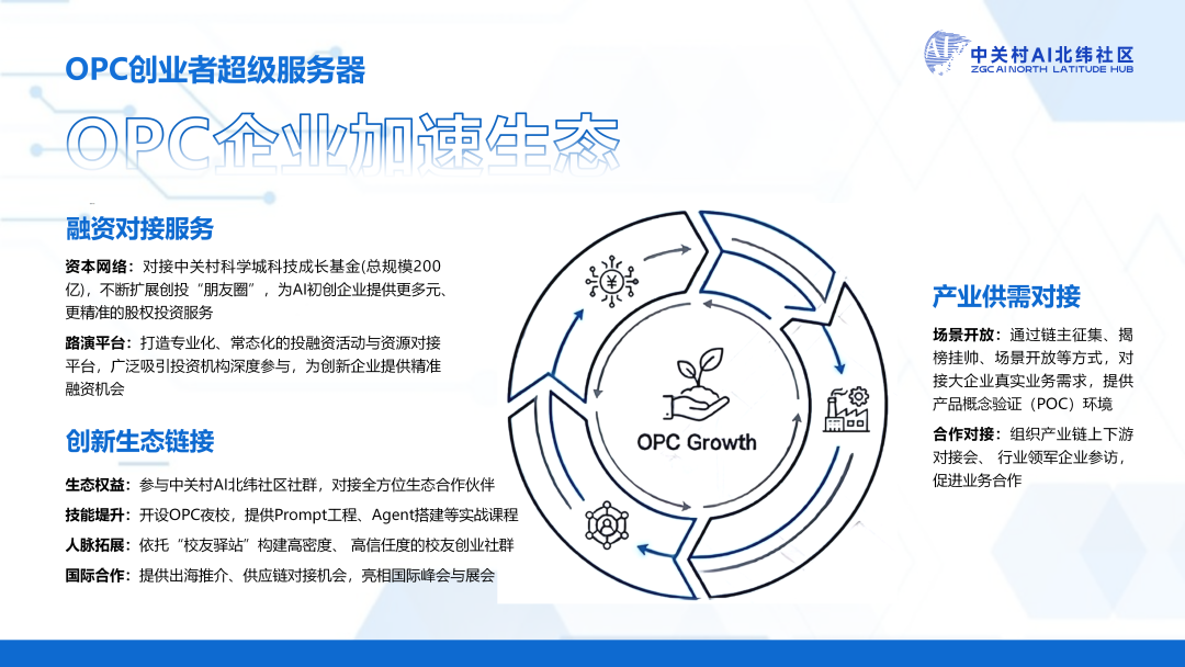 产业生态-企业加速生态: 中关村AI北纬社区链接中关村科学城科技成长基金,打造常态化路演平台,为OPC创业者提供股权投资服务。同时支持OPC企业接入社区全链条创新生态,通过开设OPC夜校实战课程,实现专业能力提升。此外通过链主征集、揭榜挂帅等方式开放真实业务场景,同步推动国际合作推广,为OPC企业搭建从资源链接、能力成长到市场拓展的闭环支撑桥梁。