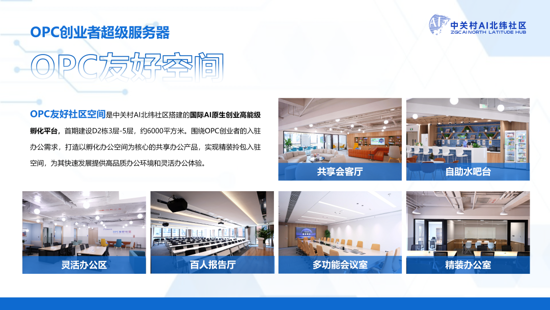 核心载体-OPC友好空间: 中关村AI北纬社区打造首期D2栋3-5层约6000平方米的OPC友好空间,涵盖精装办公室、共享会客厅、多功能会议室等多元场景,配套运动场、健身房、便利店等完善设施,支持OPC创业者拎包入驻。申请入驻且符合入园条件的项目团队,可享受优惠办公场地支持与配套人才公寓政策,切实解决OPC创业者后顾之忧。