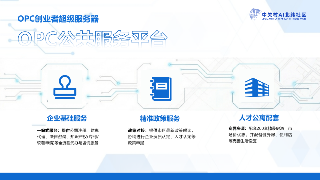 基础保障-公共服务平台: 中关村AI北纬社区搭建OPC一站式公共服务平台,严选服务机构资源,为OPC公司注册、财税代理、法律咨询、知识产权申报等提供全流程辅导对接,并可享专属费用优惠,有效降低运营成本。同时精准匹配OPC产业与人才政策,为OPC企业提供政策解读、资质认定、申报指导等精准服务,助力OPC创业者高效获取政策支持。